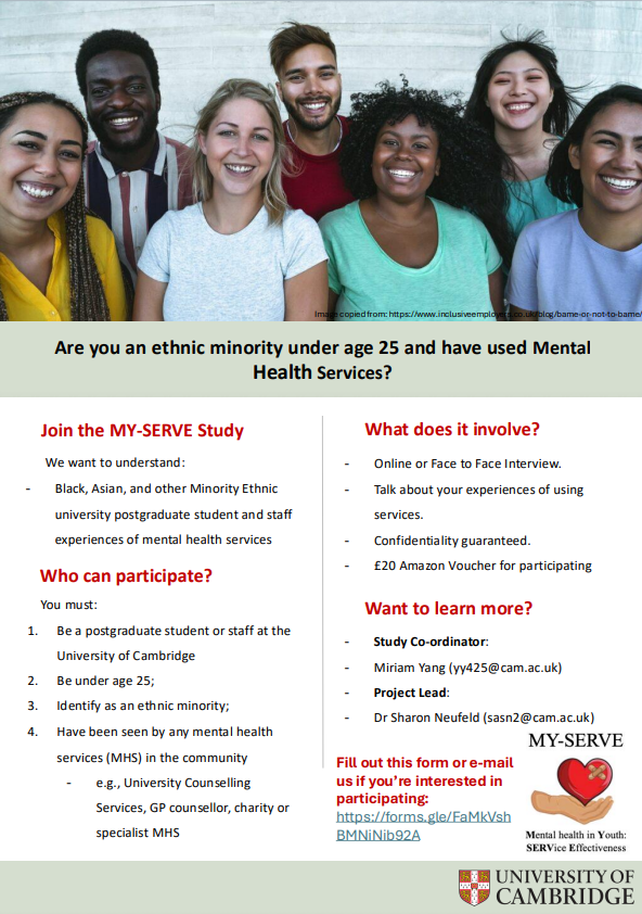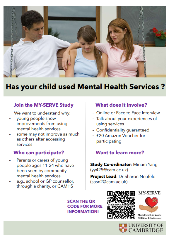 The My-SERVE Study is looking to interview caregivers/parents of young people ages 11-24 who have been seen by community mental health services. They are also looking for ethnic minority postgraduate students and staff from the University of Cambridge under age 25 with experiences of mental health services. More information available on their website.Â