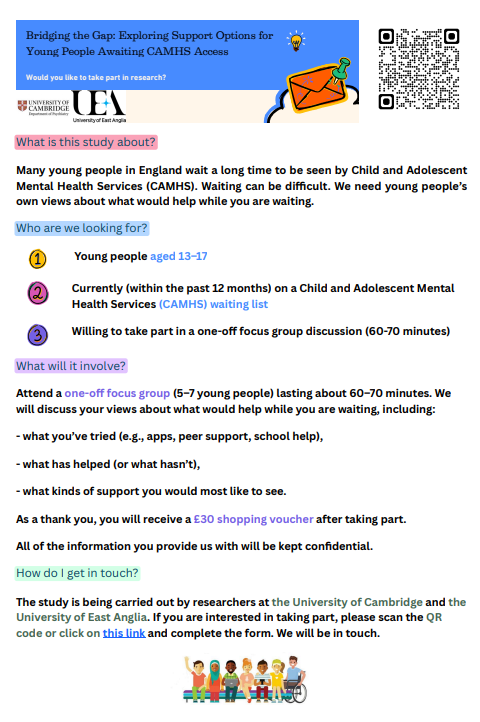 Many young people in England wait a long time to be seen by Child and Adolescent Mental Health Services (CAMHS). Waiting can be difficult. We need young people’s own views about what would help while you are waiting. This study is recruiting young people aged 13–17 who have been on a CAMHS waiting list within the past 12 months to take part in a focus group. Click this link to sign up on their webform.