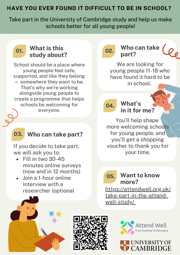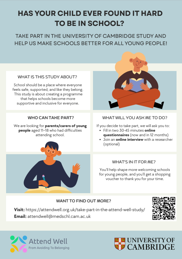 School should be a place where everyone feels safe, supported, and like they belong. This study is working with young people to create a program that helps schools understand why it can be hard for young people to be in school—and what could help to make it better. This study is open to young people and parents across the UK and is conducted online. You can find more information here on their website.Â